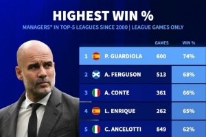 体育资讯9月15日讯 德国转会市场统计了本世纪五大联赛教练的联赛胜率,并列出榜单,瓜迪奥拉执教600场,取胜446场,胜率74%居首。