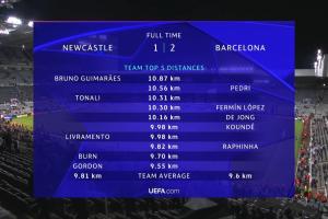 体育资讯9月19日讯 纽卡对阵巴萨的欧冠首轮比赛结束,最终纽卡1-2输给巴萨,全场比赛的跑动数据也已经公布。