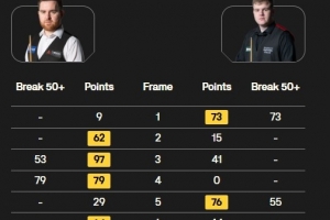 全场比赛杰克-琼斯打出两杆50+(53、79),亚伦-希尔打出两杆50+(73、55),亚伦-希尔先下一城,杰克-琼斯连胜三局3-1领先进入中场休息,中场休息过后亚伦-希尔扳回一局,随后杰克-琼斯连下两城锁定胜局。