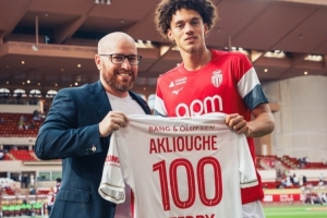 体育资讯9月21日讯 法甲第5轮,摩纳哥主场对阵梅斯。赛前,阿克利乌舍领取了百场纪念球衣。