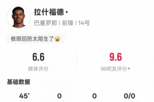 体育资讯9月22日讯 2025-26赛季西甲第5轮,巴萨3-0赫塔费。拉什福德下半场替补出战,2次射正全场最多,传球成功率93.8%,评分6.6。
