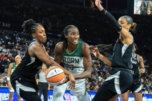 作为联盟中的传统强队,拉斯维加斯王牌在首轮遭遇了西雅图风暴的顽强抵抗。系列赛首战,王牌展现出强大的统治力,以102-77的悬殊比分大胜风暴,阿贾-威尔逊全场砍下29分8篮板,杰基-杨也有18分7助攻入账,王牌凭借出色的进攻效率和强硬的防守,早早确立了领先优势。