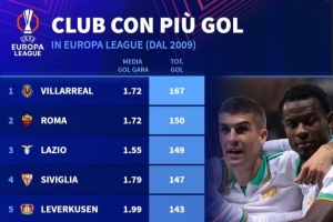 体育资讯9月25日讯 日前,德国转会市场网站统计了2009年以来欧联杯进球数排行,比利亚雷亚尔以167球居首,塞维利亚第四、曼联第六。