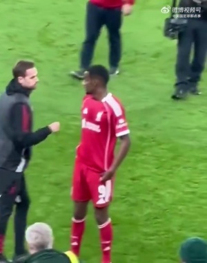 【中场加练】利物浦2比1南安普顿的比赛,伊萨克在第43分钟打入利物浦首球。中场休息时,他被利物浦工作人员拦下,要求进行折返跑。伊萨克笑着接受了这个安排