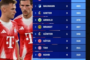 体育资讯9月26日讯 德国转会市场盘点了德甲现役球员联赛出场数,诺伊尔以527场居首,基米希、格雷茨卡均299场闯进前10,即将迎来300场里程碑。