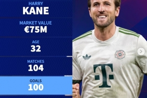 在拜仁4-0不莱梅的德甲联赛中,凯恩完成梅开二度,打进自己在拜仁的第100球,同时也跻身为单一俱乐部最快打进100球的前十球员行列。