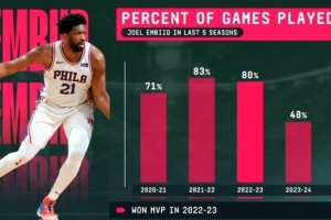 恩比德近5个赛季的出勤率:
