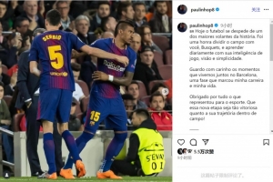 体育资讯9月27日讯 布斯克茨宣布在本赛季结束后退役,前巴萨队友保利尼奥社媒发文致敬。