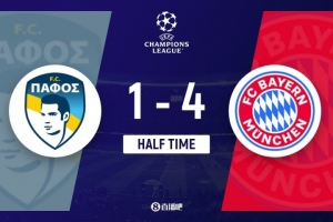 上半场没有伤停补时,半场结束,拜仁暂4-1帕福斯。