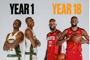 杰夫-格林与杜兰特在2007年同年进入联盟,两人在超音速/雷霆做了三年半的队友。今夏,杜兰特加盟火箭,两人再成队友。