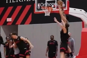 值得一提的是,在昨日的训练中,申京面对亚当斯的防守贡献了一记暴扣,前者还在社媒晒出暴扣的图片并@海王,写道:“就是在你头上扣篮,你这混球!”