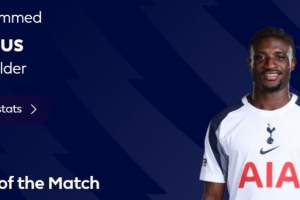 本场比赛热刺球员库杜斯发挥出色,打进一球并且助攻一次,完成6次过人,赛后他也当选英超官方球迷票选全场最佳球员。