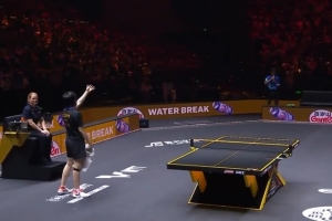 本场第一局比赛后,王楚钦向裁判投诉多次闪光灯干扰比赛,无奈的走回休息区。