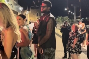 乔治在夜店门口排队,还戴着护膝。身前站着的是他的妻子Daniela