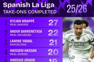 体育资讯10月7日讯 日前,Squawka统计了本赛季西甲过人次数排行,姆巴佩以27次过人居首。