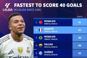 体育资讯10月8日讯 德国转会市场列出了1990年以来最快达成西甲40球榜单,C罗41场居首,姆巴佩42场次席。