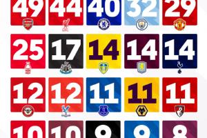 英超各队的最长连续不败场次一览