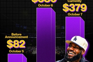 体育资讯10月8日讯 根据二手票务平台的报道,在詹姆斯发布“决定二”预告前,湖人新赛季最后一个主场最便宜的票价为82美元。而随着詹姆斯发布预告,最低票价上涨到580美元。