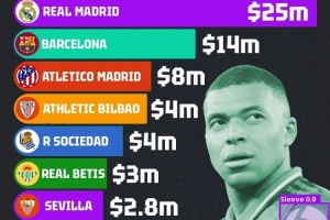 体育资讯10月8日讯 Sponsorlytix统计了西甲各队每年的衣袖广告收入,并列出榜单,皇马2500万美元居首,巴萨1400万美元次席。