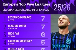 体育资讯10月9日讯 Squawka统计了球员本赛季在五大联赛运动战中创造重大机会的次数,并列出榜单,迪马尔科、洛佩斯7次居首,尼科-帕斯6次第三。
