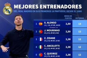 体育资讯10月10日讯 德国转会市场统计了2000年以来皇马主帅前16场比赛的胜利场次,并列出榜单,阿隆索13胜居首,穆里尼奥、齐达内、安切洛蒂12胜。