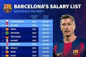体育资讯10月10日讯 德国转会市场列出了巴萨球员年薪排名,莱万2080万欧居首,德容1900万欧次席。