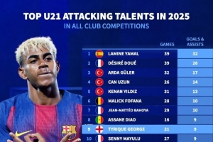 体育资讯10月11日讯 德国转会市场列出了2025年五大联赛U21球员参与进球榜,亚马尔32球居首,杜埃26球次席。