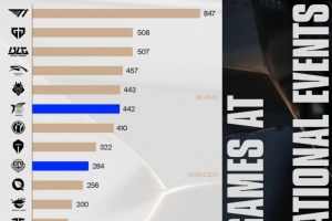 体育资讯10月12日讯 LCP官推发布本次世界赛各战队选手参加国际赛事(先锋赛/MSI/S赛)场次之和,T1居首,GEN第二,BLG位列第三;