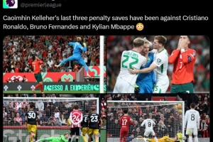 体育资讯10月12日讯 英超官方发布数据,凯莱赫近3次扑点分别扑出了C罗、 B费和姆巴佩的点球。