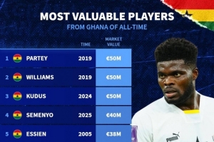 体育资讯10月13日讯 德国转会市场列出加纳球员历史最高身价排名,托马斯、伊纳基-威廉姆斯、库杜斯5000万欧居首。