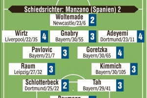 后卫:劳姆(3)、施洛特贝克(2)、若纳坦-塔(3)、基米希(3)