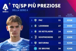 体育资讯10月16日讯 日前,德国转会市场统计了意甲前腰、二前锋身价排行,尼科-帕斯5500万欧居首,德布劳内2000万欧并列第五。