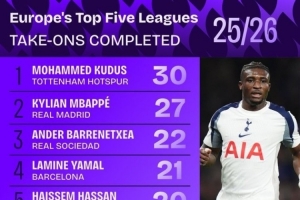 体育资讯10月17日讯 根据本赛季欧洲五大联赛的数据统计,热刺球员库杜斯以30次成功过人领跑该项数据榜,皇马前锋姆巴佩以27次紧随其后。