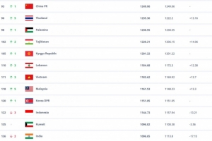 体育资讯10月17日讯 FIFA更新最新一期国家队排名,亚足联国家队方面,国足积分不变,但排名从世界第94位升至世界第93位,亚洲排名则仍是第14位。