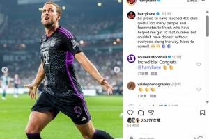 凯恩也在社媒发文纪念这一特殊时刻,写道:“很自豪能够完成俱乐部生涯400球,达成这一纪录得益于太多人的帮助,没有大家一路的支持我不可能做到。未来还有更多进球!”
