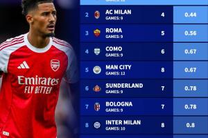1-阿森纳(12场丢3球,场均0.25)