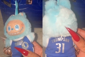 她晒出了一个特别的拉布布,这个拉布布穿着克莱的独行侠31号球衣,脖子上还带着独行侠Logo的大链子。