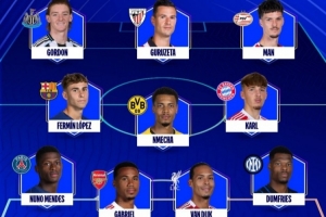 后卫:努诺-门德斯(巴黎)、加布里埃尔(阿森纳)、范戴克(利物浦)、邓弗里斯(国米)