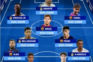 体育资讯10月24日讯 本周末,西甲将上演万众瞩目的西班牙国家德比。德国转会市场盘点了皇马和巴萨球员历史身价最高阵,梅西、姆巴佩、亚马尔等悉数在列。