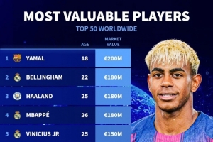 体育资讯10月25日讯 德国转会市场列出了球员身价前50排名,亚马尔2亿欧居首,贝林厄姆、哈兰德、姆巴佩1.8亿欧次席。