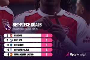 本赛季英超球队通过定位球破门球队排行榜↓