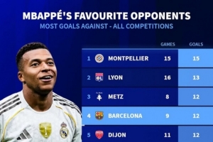体育资讯10月27日讯 皇马在本轮西甲焦点战2-1力克巴萨,姆巴佩取得进球。《转会市场》统计显示,巴萨也是姆巴佩生涯各项赛事进球第4多的对手。