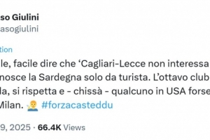 朱利尼写道:“亲爱的卡迪纳莱,当你对(卡利亚里主场所在地)撒丁岛的了解仅限于游客视角时,说‘没人关心卡利亚里对阵莱切的比赛’会很容易。作为意大利球迷数量排名第八的俱乐部,卡利亚里既有观众关注,也备受尊重。而且谁知道呢,在美国,或许支持卡利亚里的人比支持米兰的还多(注:在美国有很多来自撒丁岛移民的后裔)。”