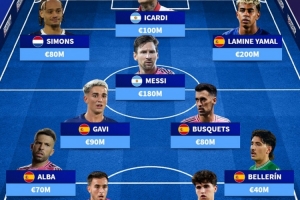 体育资讯10月29日讯 德国转会市场根据巴萨青训出身现役球员的历史最高身价,列出身价最高阵容,梅西领衔,亚马尔、伊卡尔迪、哈维-西蒙斯、奥纳纳在列。