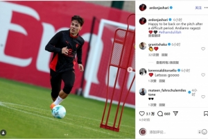 亚沙里社媒晒出训练照片,并写道:“很高兴在度过一段艰难时期之后重返球场,加油兄弟们!”