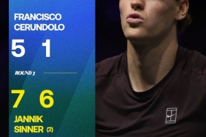 两盘比分:7-5、6-1,下一轮辛纳将对阵谢尔顿。