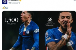 本场比赛也是切尔西队史收获的第1500场顶级联赛胜利,其中对阵热刺68场胜利是所有对手中最多的,蓝军官推也晒出海报纪念达成这一里程碑时刻。