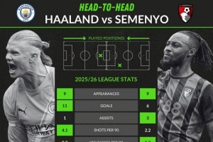体育资讯11月3日讯 本轮英超,曼城将主场对阵伯恩茅斯。赛前WhoScored列出了两队主要得分手哈兰德和塞梅尼奥的数据对比。