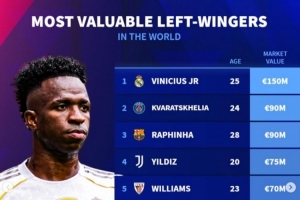 体育资讯11月3日讯 德转列当前世界足坛左边锋身价排行,维尼修斯1.5亿欧居首,克瓦纳茨赫利亚、拉菲尼亚9000万欧并列第二。