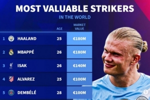 体育资讯11月3日讯 德转列当前世界足坛中锋身价排行,哈兰德、姆巴佩1.8亿欧并列最高,伊萨克1.4亿欧,阿尔瓦雷斯、登贝莱1亿欧。
